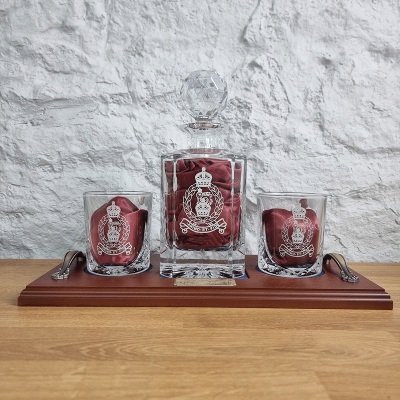 Military decanter on a tray with 2 crystal tumblers.