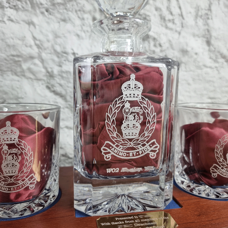 The decanter is laser engraved for a sharp finish and then painted with pewter paint so the design stands out.