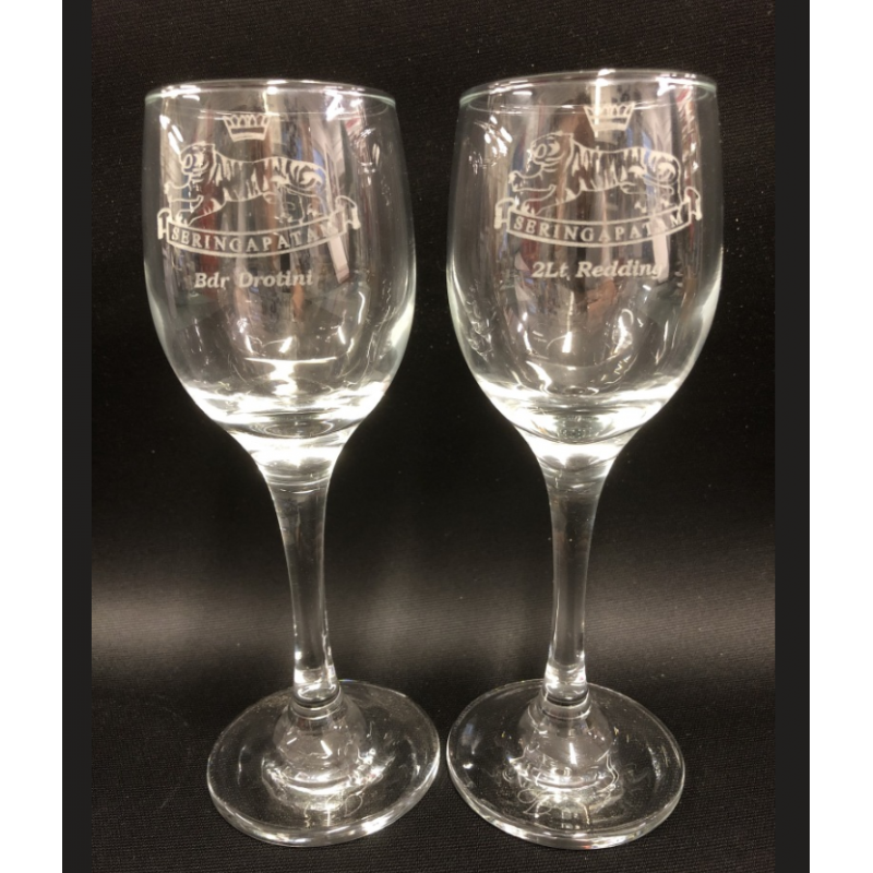 Engraved with a badge or a small amount of text. Each glass can have a different badge if required. Engraved on one side.
